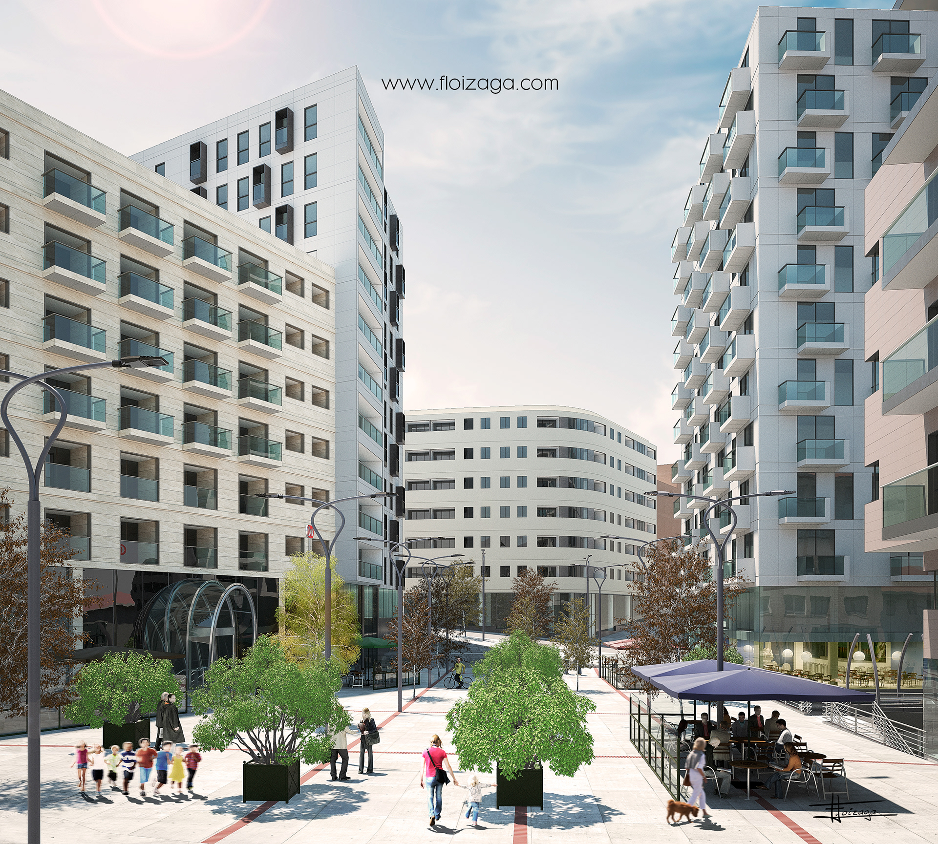 LINEAS MAESTRAS DE LA MODIFICACIÓN DE LA ORDENACIÓN ESTRUCTURAL DEL PLAN GENERAL DE ORDENACIÓN URBANA. Dada la naturaleza del proyecto, en este trabajo se ha dedicado mayor detalle al proyecto de ordenación urbanística y en general al ambiente generado. Los edificios nuevos intentan ser un paso mas adelante del mero volumen vacío utilizado habitualmente en este tipo de proyecto y que no nos cuenta nada mas allá del espacio que ocupan. En este caso se han definido dichos edificios nuevos con un detalle medio para trasmitir la idea que el arquitecto ha guiado vía bocetos e imágenes de referencia. Para los edificios existentes que permanecerán en el futuro, se ha modelado su volumen y texturizado adecuadamente para poder representarlos del modo mas correcto integrados en los puntos de vista elegidos para visualizar el proyecto.